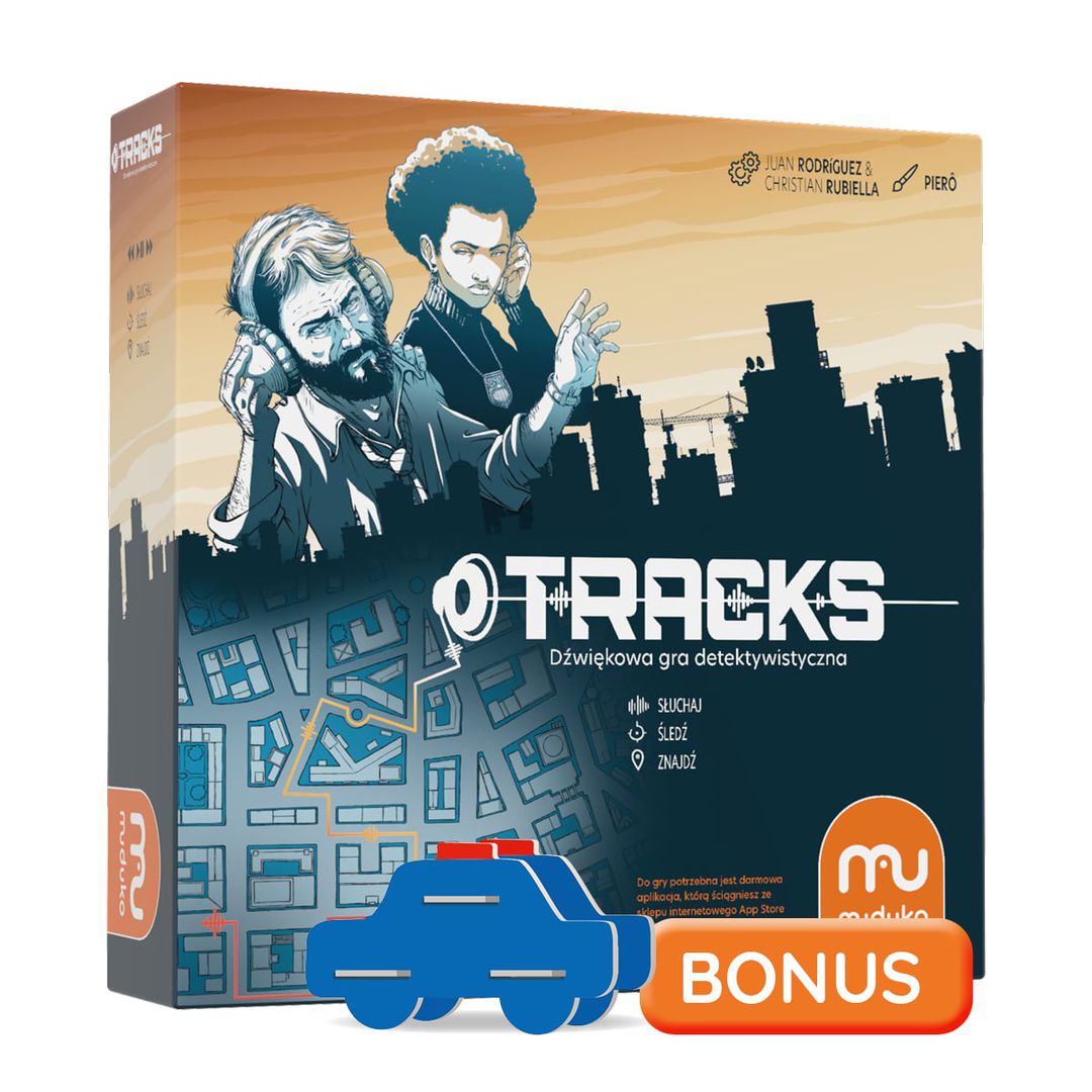 Tracks : dźwiękowa gra detektywistyczna / autorzy Juan Rodríguez & Christian Rubiella ; ilustracje Pierô ; tłumaczenie Marta Duda-Gryc. - Podłęże : Wydawnictwo Muduko - Fabryka Kart Trefl-Kraków, [2025]. - 1 gra (folder policyjny, arkusz z zasadami gry i 15 akt spraw, plan miasta Siren Bay z podziałem na 9 rejonów, 55 kart monitoringu, ulotka turystyczna o mieście, darmowa aplikacja) : tektura, kolorowa ; w pudełku 21x21x6 cm + instrukcja.