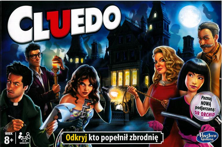 Cluedo : odkryj kto popełnił zbrodnię. - Warszawa : Hasbro, 2015. - 1 gra (1 plansza do gry, 6 pionków postaci, 6 narzędzi zbrodni, 50 kart (6 kart postaci, 6 kart narzędzi, 9 kart pomieszczeń, 29 kart wskazówek), 1 koperta, 1 zeszyt z arkuszami detektywistycznymi, 2 kostki ) : karton, tektura, plastik, kolor ; w pudełku 27x40x5 cm + instrukcja (10 stron : ilustracje ; 21 cm).