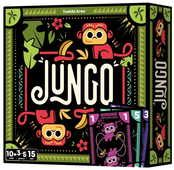 Jungo / Toshiki Arao ; ilustracje: Laura Michaud. - Gdańsk : Rebel, 2024. - 1 gra (64 karty z liczbami (po 8 kart z liczbami od 1 do 8), 8 podwójnych kart ( po 2 karty z parami liczb: 1/2, 3/4, 5/6, 7/8) : karton, kolor ; w pudełku 3x11x11 cm + instrukcja (8 stron : ilustracje ; 10X40 cm).